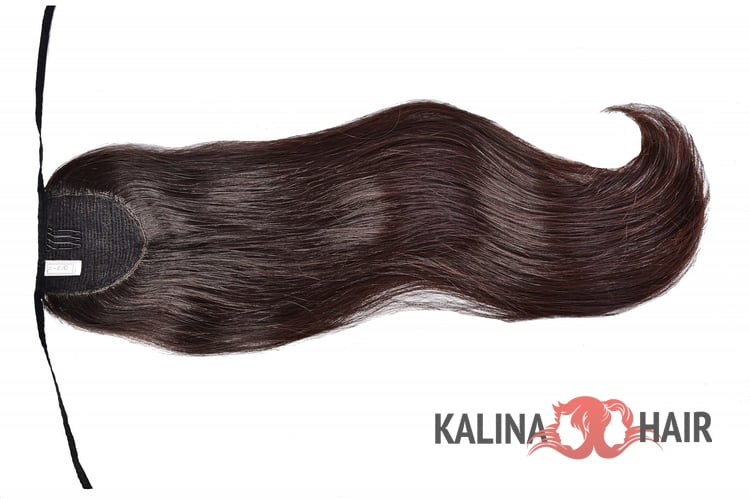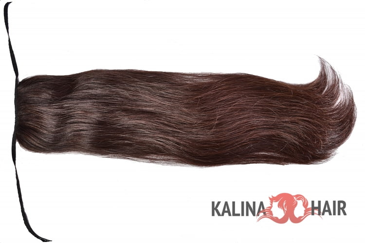 Хвост темно-русого цвета имеет холодный подтон. У основания оттенок немного темнее, чем на кончиках. Такой плавный переход обеспечивает натуральный и естественный вид при ношении. Место соединения с накладным хвостом практически незаметно. Его можно украсить красивой резинкой или заколкой.